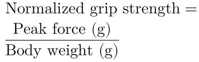 Five consecutive tests were performed on each mouse, and the mean maximum limb muscle strength value (grams) (g) was calculated.